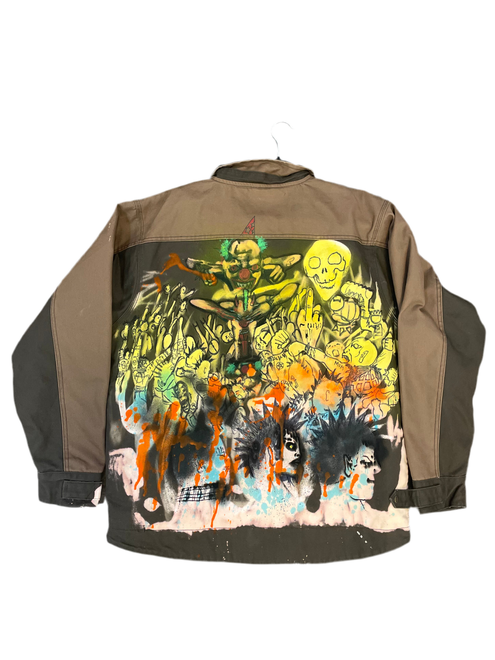 Stand out from the crowd with our exclusive CrimeWave anarchist custom jacket! Made with heavy duty dry duck material, this one-of-a-kind jacket features an anti-establishment design by our resident artist. Only one available in size Large. Make a statement and stay warm with this unique jacket.